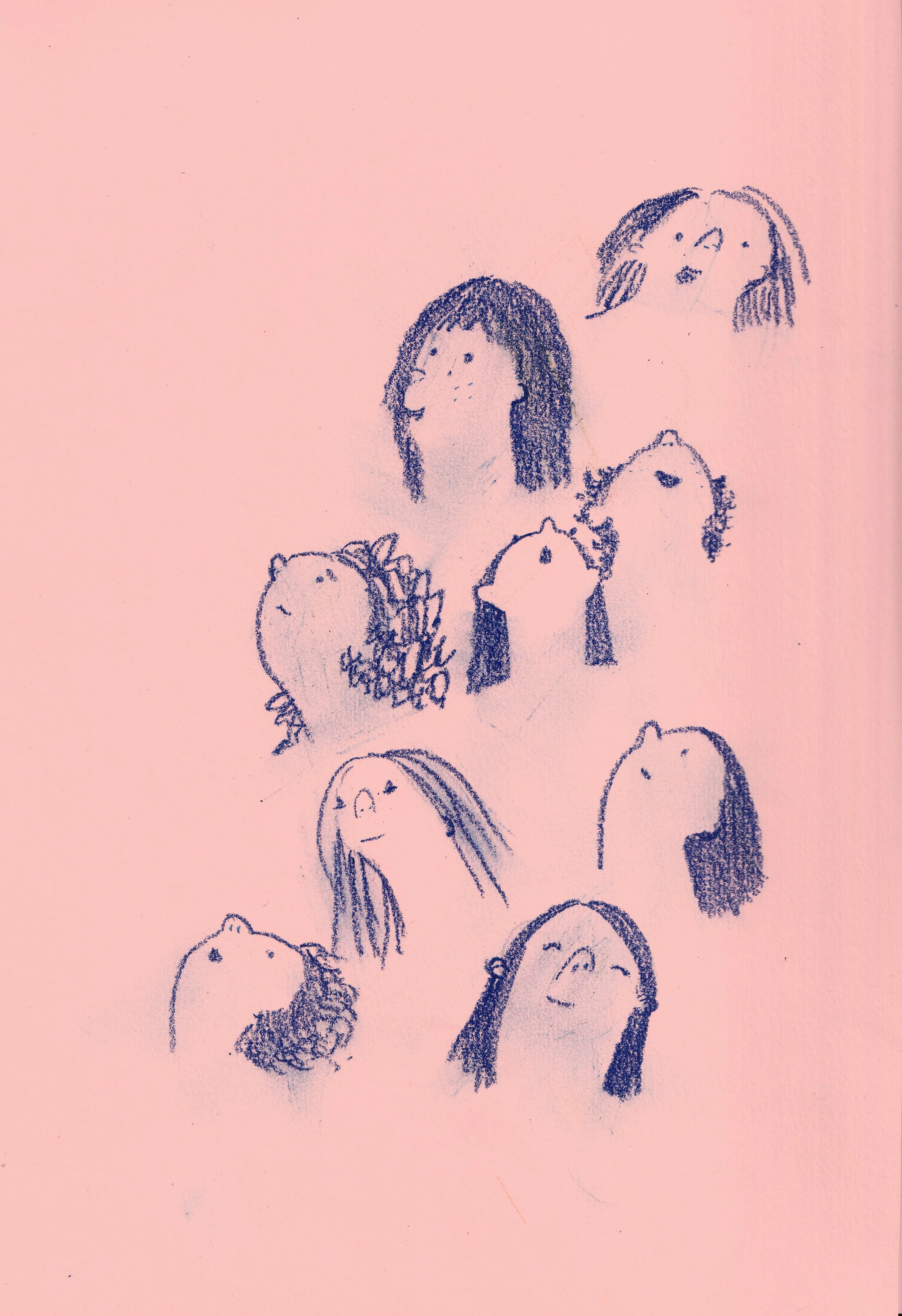 pencil illustration on a green background. Three girls walking through a brick change room at a pool. brick wall behind, pigeons in louvred windows. picturebook illustration. Jaclyn Bates