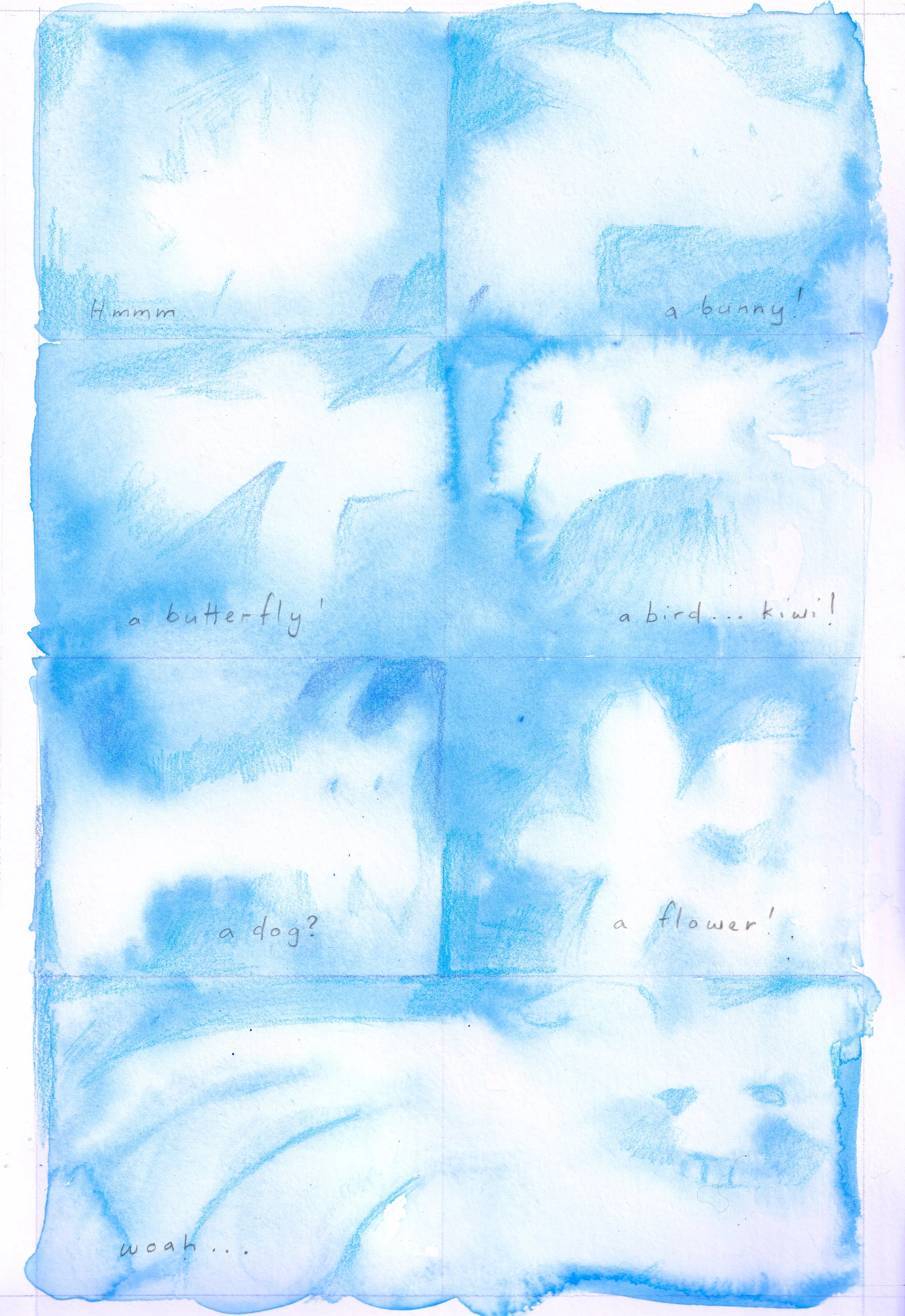 wet on wet watercolour on paper. Three children looking at each other. wobbly lines in blue washes. children’s illustration. Jaclyn Bates